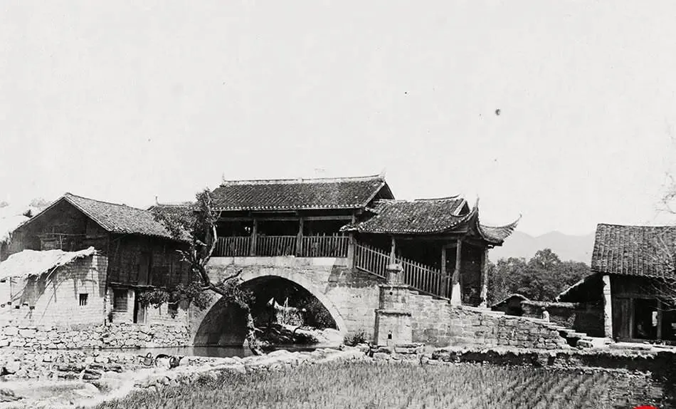 图中这座带回廊的石拱桥,老辈子叫廊桥或风雨桥,桥身是青石砌的,面上木柱木栏,一溜灰黑瓦压着,檐角微微上挑,有点小脾气的样子,桥脚下就是水田,秧苗像新剃的平头,一行行贴着水光,春天水涨的时候,村里人挑担子走桥廊,雨点砸在瓦面上,声音闷闷的,走着走着就不急了。