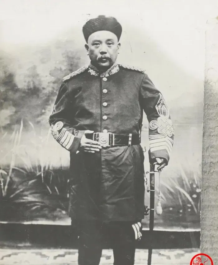 这个硬挺的套装叫1905式新军制服,呢料发亮,立领贴着滚边,胸前一溜铜钮扣像豆子一样排队,腰上束着粗大的皮带,金属扣头晃眼,刀鞘垂在腿侧,站定了也不显利索,衣服合身是门学问,这位穿着反倒把肚子托得更圆,整个人被制服勒出几道褶子,气势有,精干欠了点,家里人看图打趣说,换身薄呢料的,也许能利落些。