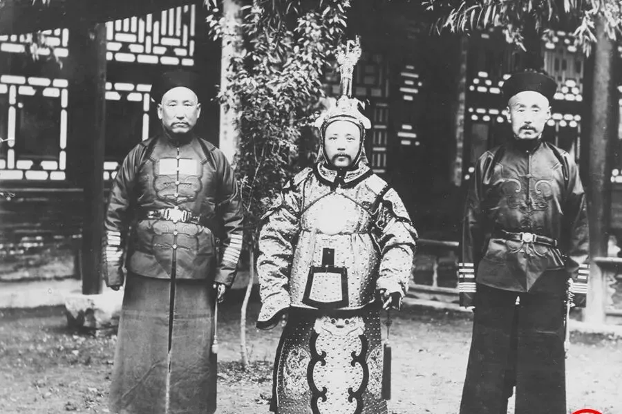 这个并排站着的组合,我更愿意叫新旧同框,中间的人披甲,左右的人束带,院子里树影斑驳,地上落叶一片片,站姿里透着拘谨也透着自豪,像一场戏要落幕了,演员还没卸妆就跑到后台照相,等到真正散场,衣箱一合,谁也不再提这身家伙什了,过去与现在就在这一步里换了位。