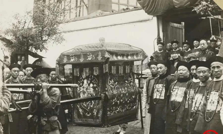 这个绣满喜字的叫大花轿,顶子四角垂着流苏,绣面是金线银线盘的龙凤,轿杆粗得要两只手抱住,抬轿的汉子肩膀上都垫着布,把子一声吆喝,队伍就稳稳出了门,门口站了一排穿补服的官员,胸口补子亮晃晃,见礼送行俱全,阵势不小,我外公常说,过去人嫁女儿讲究门面,锣鼓一响,街巷跟着热闹,现在婚车一溜喇叭走得快,热闹换了法子。