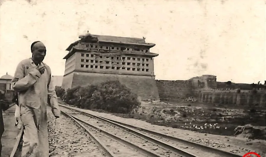 这个拐角处的高大建筑叫角楼,砖墙上有破口,檐角还挑着翘翘的飞檐,脚下两股钢轨顺着地势一路伸出去,铁轨边站着人,衣衫单薄,手里提着小包,老城与新路在同一画面里碰了个头,以前车马慢,转一圈得半天,现在火车呼啸一过,城门的影子都被带碎了,老的架子还在,新东西已经上道,这种交界的时刻,最能看见时代的步子。