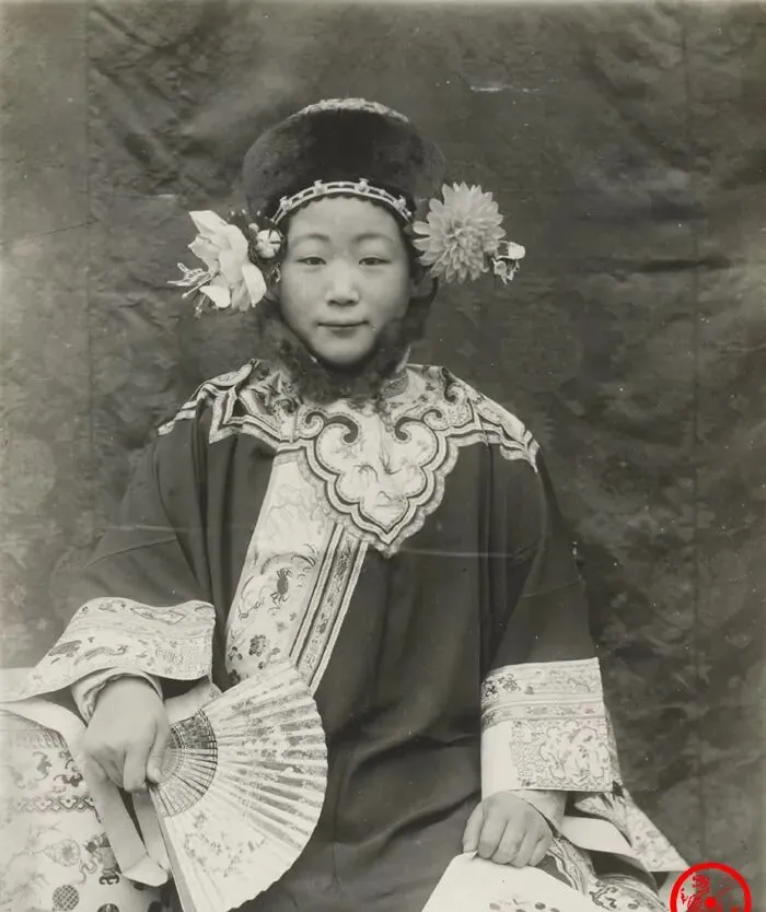 这个端坐在镜前的小姑娘叫八旗小姐,一手扇子一手绢子,头上绒花和团帽压得稳稳的,衣料厚实,袍襟上的团寿纹一圈圈翻着光,笑也不露齿,像在等人招呼,她的妆束讲究的是体面,坐相也讲究稳定,外婆看见连连点头,说那会儿出门得学规矩,扇子怎么合,手绢怎么拿,一身衣裳就是一部家学,现在拍照讲究轻松,咔嚓一下就完事了,仪式少了点,但自在多了些。