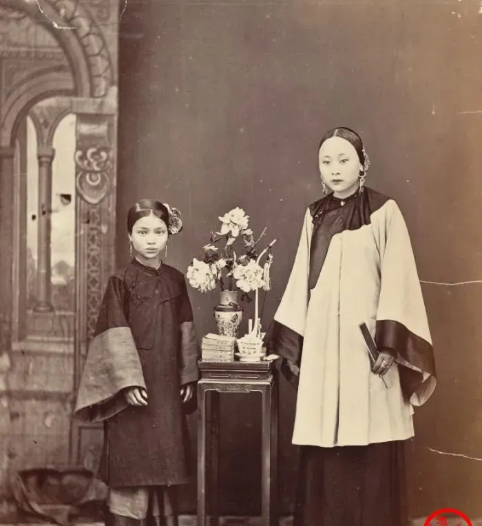 这个穿法叫袄裙配大摆袖,母亲手里握着一把折扇,女儿的鬓角别了朵绢花,桌上花瓶是广彩的调子,色彩浓得发甜,母亲不笑,女儿也学着板着脸,像在学大人过日子的样子,以前女人拍照讲“庄”,不随便露牙齿,现在小姑娘张口就笑出八颗牙,时代把镜头感这件事改了个底朝天。