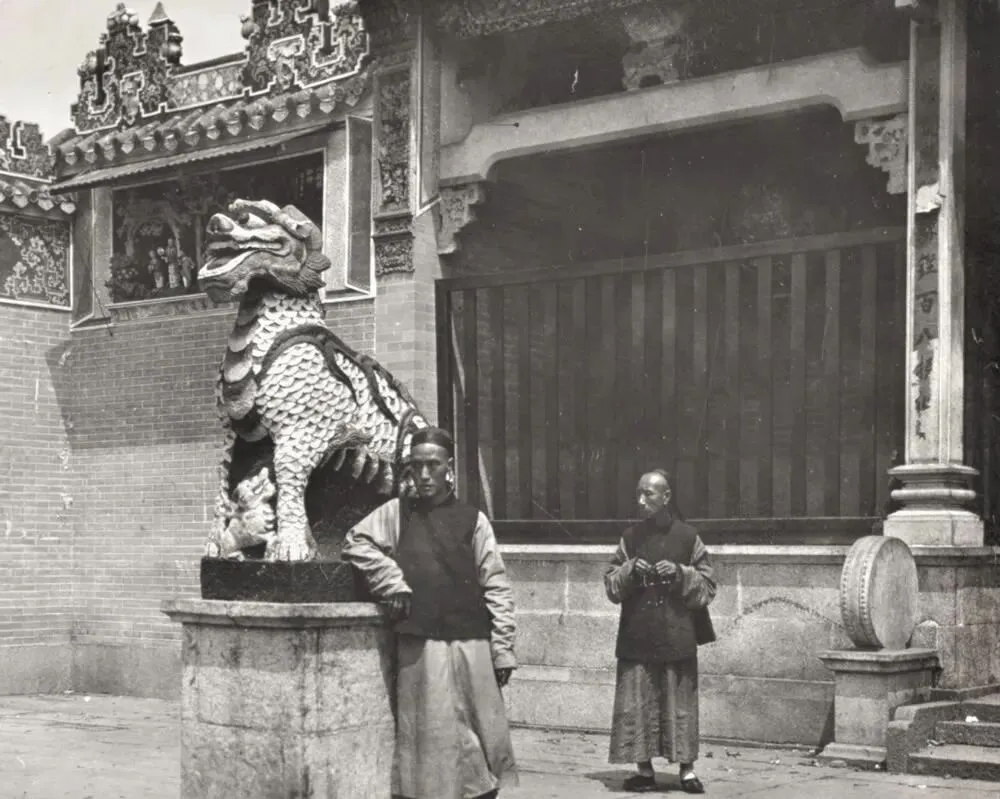图中门口这尊石狮子叫麒麟狮,身上鳞片一块块起伏,石质发灰带斑点,底座是青石条拼的,旁边这位穿着长袍马褂的人站得松,手插在袖里,鞋尖是方口布鞋,戏里动不动就绫罗绸缎金光闪闪,真实街头更多是这种朴素的深色料子,日头下不扎眼也耐脏,爷爷看见照片就笑,说那会儿进庙门先拱手,再点根香,不是谁都敲锣打鼓的。
