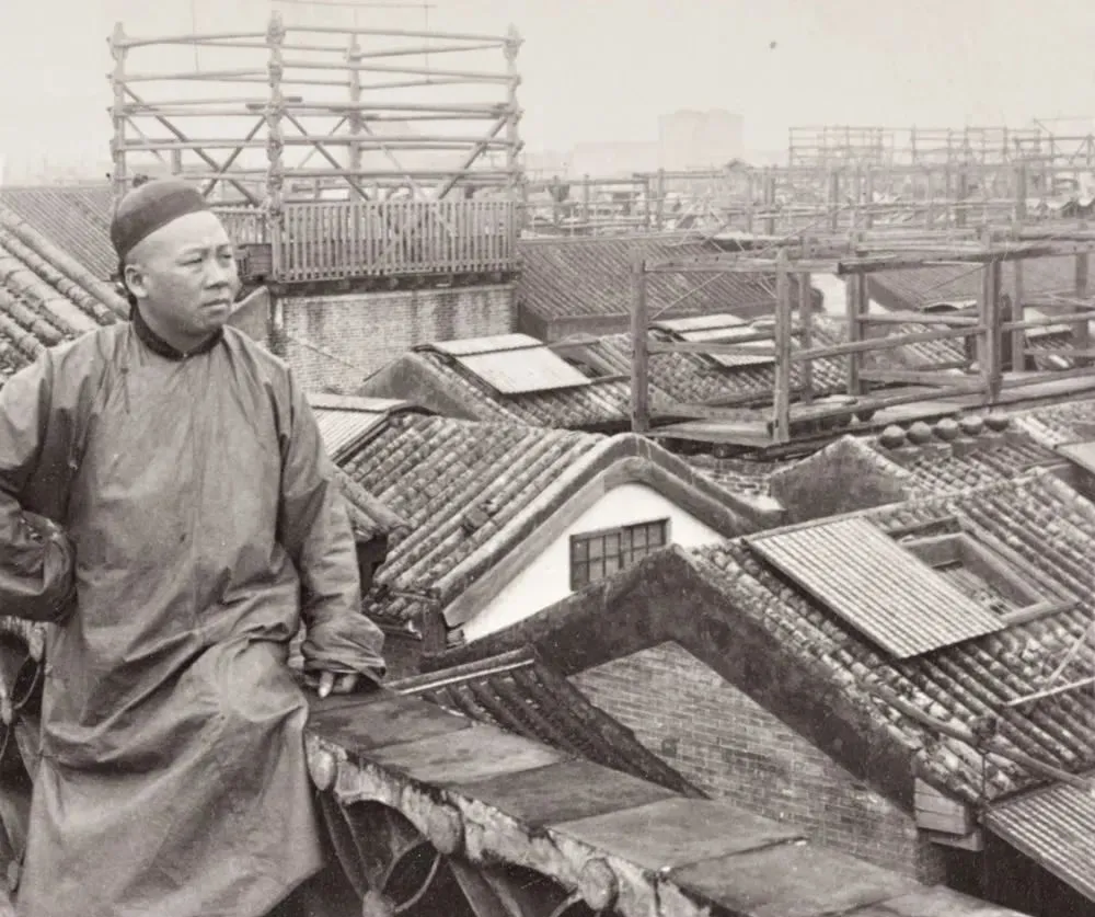 图上灰青瓦一浪接一浪,这些带木栏的高台叫晒台,四根木柱架起横梁,围起栅栏,人家在这儿晒布晒药材,也能乘风纳凉,这位站在脊上的汉子把衣襟一拢,手按瓦当边走,不慌不忙,城里生活不止八旗军号子和御膳房,更多是屋上晒谷下头卖菜的日常。