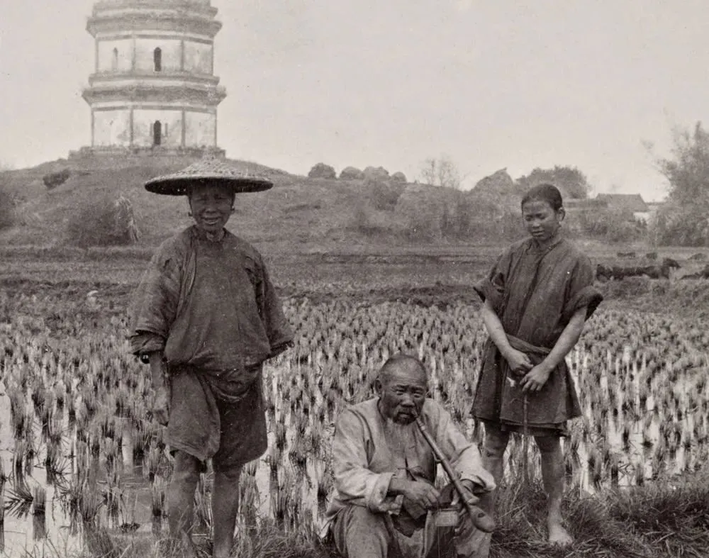 图中田里的锥形草帽叫箬笠,边沿宽大能挡雨,脚下黑乎乎的是秧脚泥,手里那把烟袋杆长得很,杆头铜质发亮,背后露出半截塔,识货的都知道是赤岗塔,爷爷说插秧时要把腰折成一张弓,手指捏秧一撮一撮点进田,节奏要匀,风一吹,秧尖齐刷刷抖一下,现在插秧机呼啦一过,快是快了,人却再也练不出那手劲儿了。