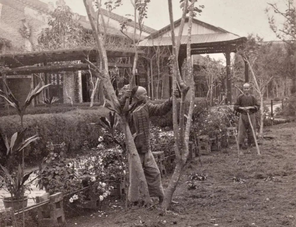 这个长柄工具叫铁锹,锹面窄长,边口磨得亮,园丁一手扶树一手撬土,身后是砖墙和回廊,广东钱局名头不小,机器轰隆铸钱的地儿,也要请人看园养花,妈妈笑着说,单位再大也离不开挑水浇花的细活,春天新栽的苗要用绳子拉住,风大了不跑根。
