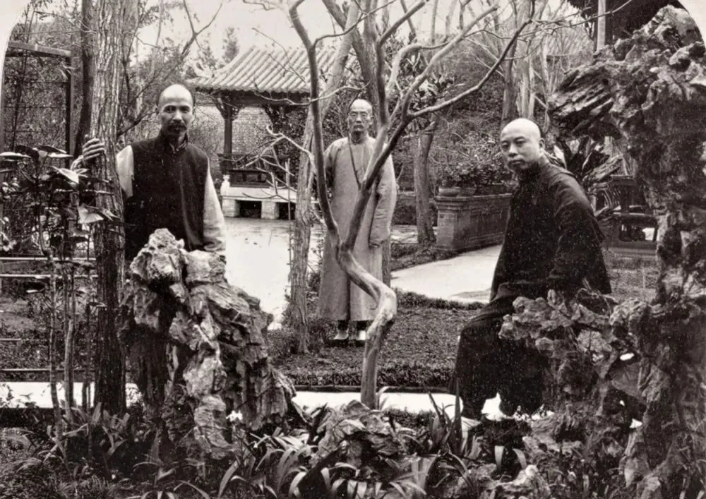 这几位站在假山边的叫官员,长袍大袖垂到手背,前襟扣成斜襟,院里摆的石头是太湖石,孔洞玲珑,旁边一株梅树细得像鞭子,石凳半隐在花丛里,他们不摆官腔,脸上是日常表情,像午后散步顺手留张照,现在我们拍照讲求找机位找光位,那时候就是站定了按一下,成片带着点糙味,反而耐看。