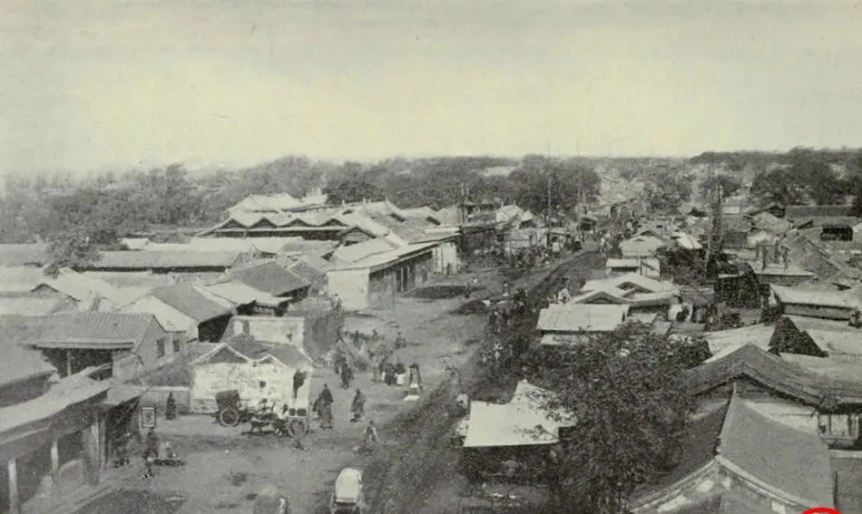 图中这条长长的街叫崇文门大街,屋顶一片灰瓦,铺着薄灰的光,街心是车辙压出的硬土路,两边摊位随意支着,棚布被风掀起一个角,远处树梢像一层雾,被风一搅就乱,老北京的脚步声从这条街里出出进进,吆喝声一串串地蹿过屋檐,现在走在城市主干道上,耳边是马达声和提示音,那时候可全靠人的嗓门撑起生计。
