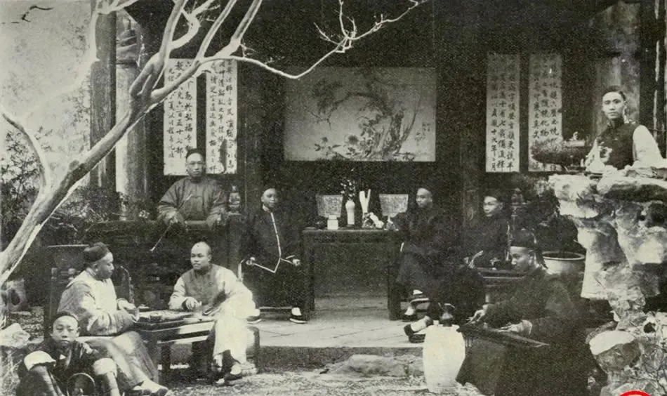 这处堂前的摆设叫案几,几上两瓶清供,旁边一架古琴静静躺着,几个人或执谱或对弈,侧边烹着小火的茶罐冒细白气,枝桠探进画面,把影子落在石案上,小时候我不懂他们在聊啥,只记得有人轻声笑,有人拨弦,弦声细得像从竹缝里钻出来的风,现在我们聚会多半端着手机拍照,那会儿人靠手和眼睛把时间泡出了味儿。