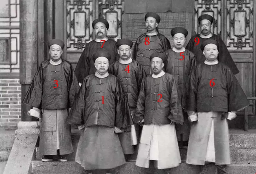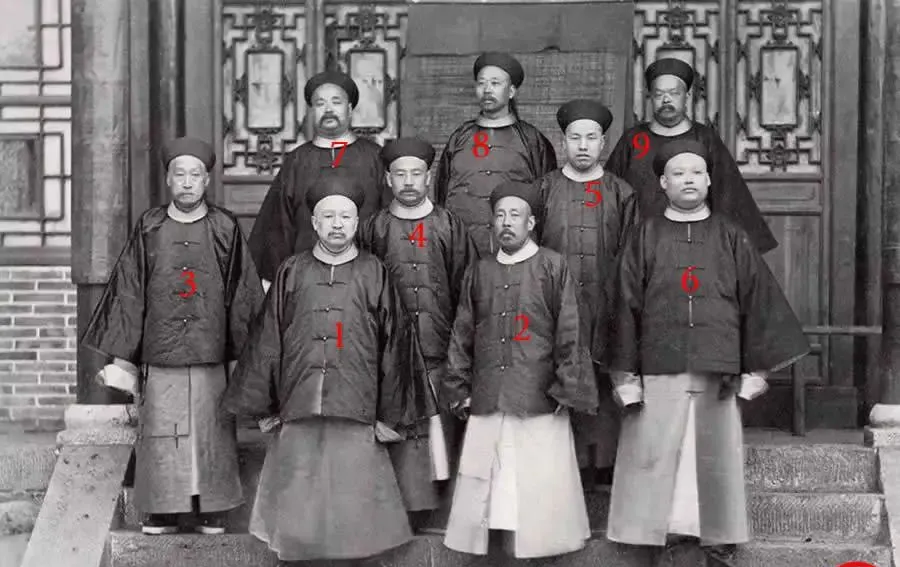 图中这一排人站得板正,圆领棉褂叠着马褂,补子隐在里层,帽顶珠子一律低调,左三右六都压着袖口,背景是镂空木作和青砖台阶,像话不多的人却都在镜头里把身份说明白了,前排一号是个身体壮实的角色,二号清瘦些眼神往前顶,四号嘴上留着短髭,七八九站后排抬着下巴,谁也不抢谁的位儿,这种队形在那会儿就叫**“在事文武”**,意思是当差的都到齐了,拍完好递档案好报功劳。