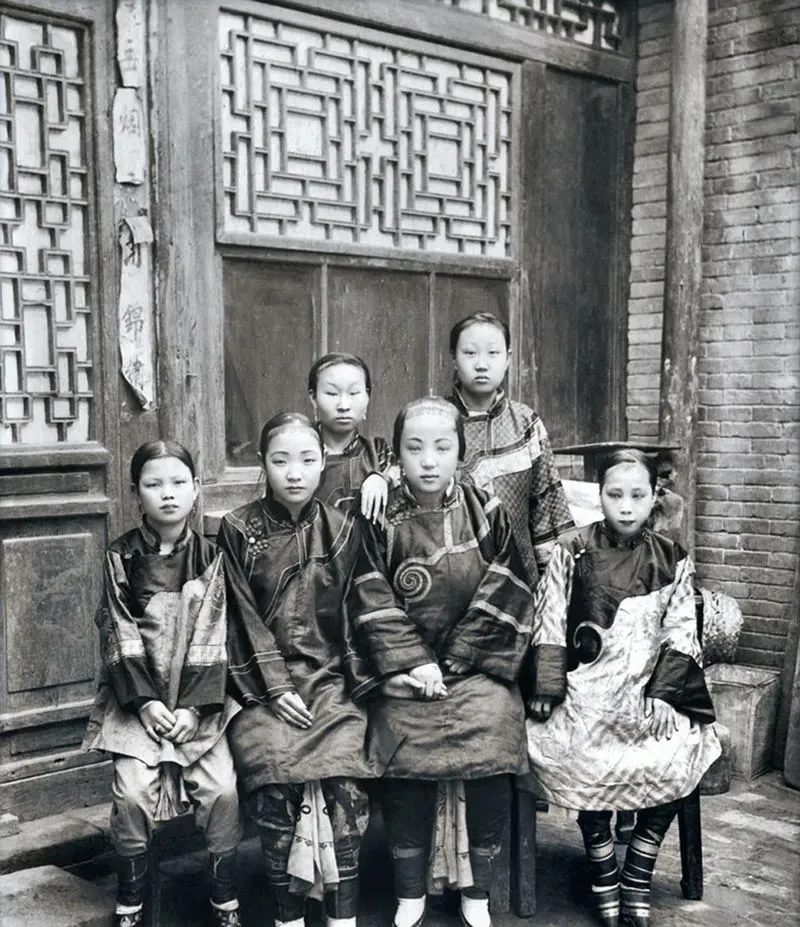 图中这群小姑娘穿的都是宽袍大袖,面料一看就是厚缎,光可鉴人,头上抹得服帖,发缝一条直线,眉心留白,耳畔坠着小小的坠饰,坐姿规矩得让人不忍打扰,细看脚上,一边小脚一边天足都能见到,旧与新挤在同一张椅子上,像两条路朝一个方向走去,奶奶看见就会说,绑脚那阵子苦得很,现在的孩子想都不敢想。