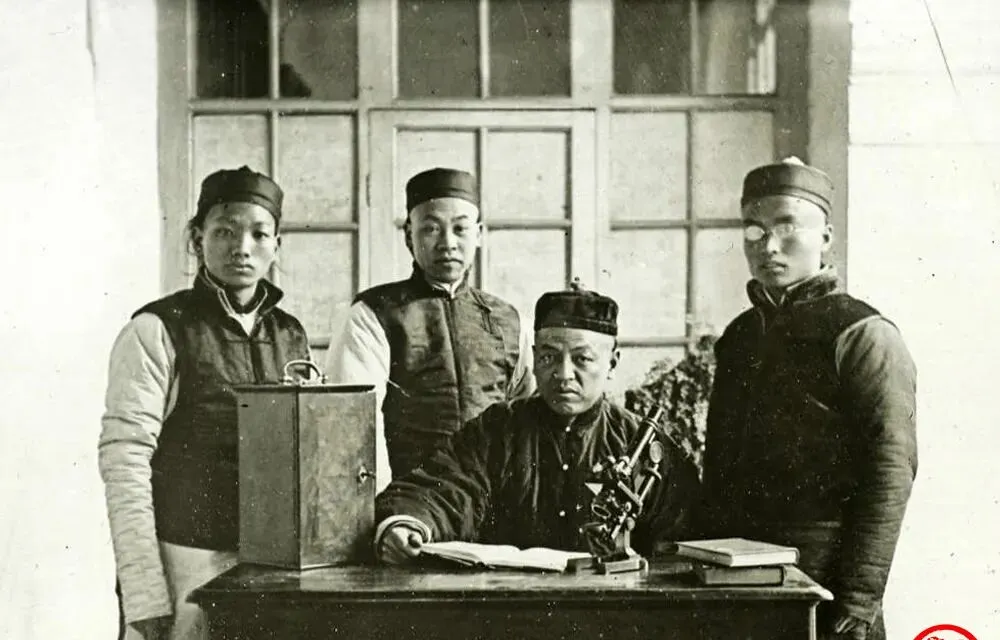 桌上那个黑亮的小家伙叫显微镜,木桌边角磨得圆润,老师端坐中间,学生站两侧,袖口里还露出棉絮的边儿,镜筒斜着对着光,估计是刚做完一堂自然课,爷爷说,以前读书背四书五经,现在好了,能看见虫子的脚了,这话听着好笑,却把那阵子的门槛一下抬高了。