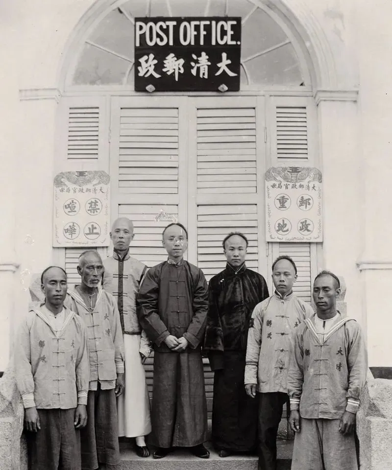 牌匾上写着POST OFFICE和大清邮政,门是百叶窗样式,合影的人里有穿直裰的,也有短褂的,前面的四位是邮差,胸口绣着字样,脚下布鞋踩得结实,邮差多是徒步,刮风下雨也得把信送到,我小时候跟着父亲等过一封手写信,站在小卖部门口看半天路,想起这些人,心里还是会咯噔一下。