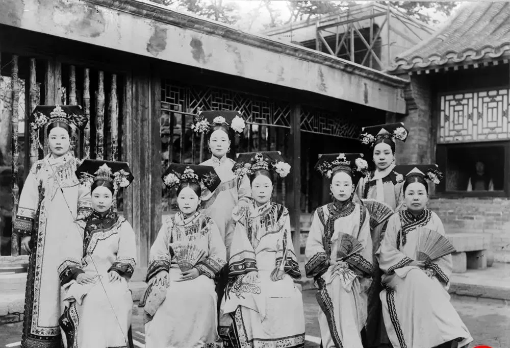 这个排场叫旗人闺秀的合影,头顶大花翘,梁上叠梁,步摇在光里微微发亮,扇面铺开,是绸是纱一眼能分出来,衣摆绣得满满当当,站一回就像开了一场小型服饰展,妈妈看了直说,这气派花在身上,可清朝一倒,很多人就没了月钱,穿再贵也要熬日子。