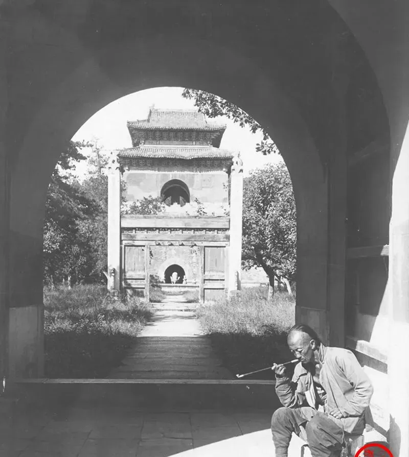 洞门像个大框,把里头的楼压成一幅画,门口的老头正叼着长杆烟袋,半闭着眼慢慢吐雾,衣裳洗得发白,袖口打了补丁,他这活儿叫守陵,护着前朝的坟,清人也懂这个理儿,修修补补留个样,后来我们再去看石像生和神道,也还能摸到当年的脉。