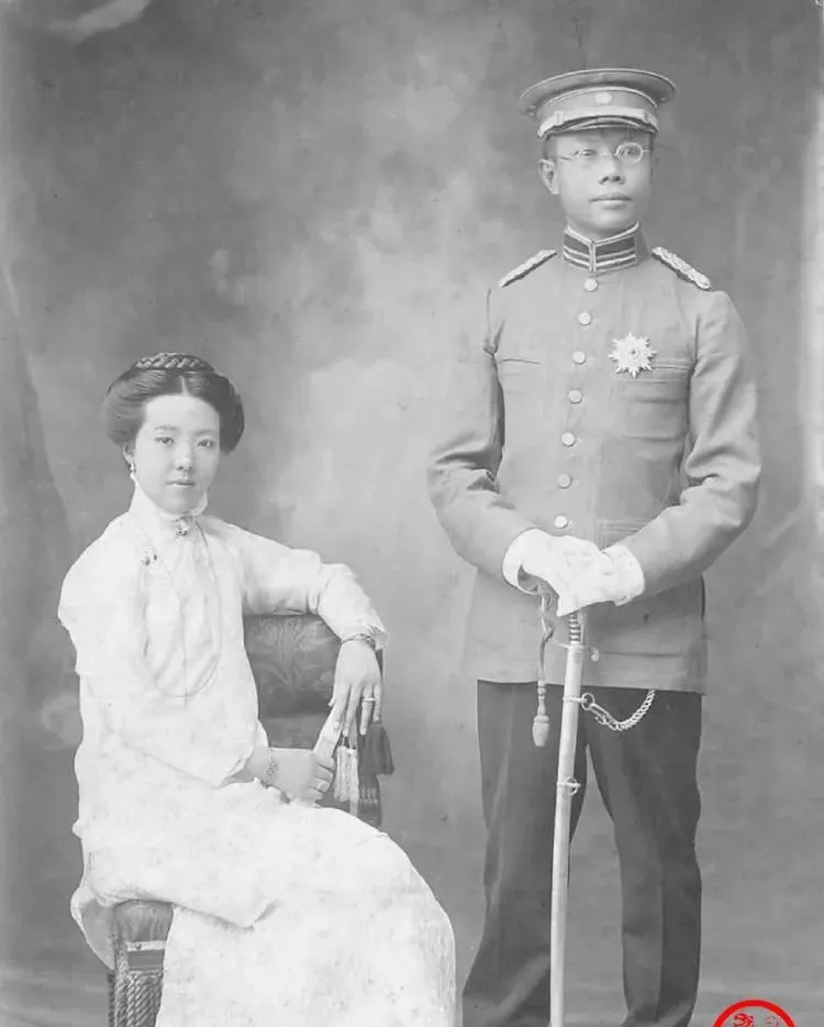 图中这身挺括的军服叫陆军礼服,呢料硬挺,立领上缀着金属叶饰,胸前一枚放光的勋章,腰间系链,手里还握着指挥杖,边上坐着的夫人盘云髻,坠一对素雅耳饰,裙褶层层压得平整,老照片没有颜色,却能看出讲究,这张像一摆出来,等于向社会宣告身份与职责,那个年代,医生兼军职不稀奇,关键是要能上阵。