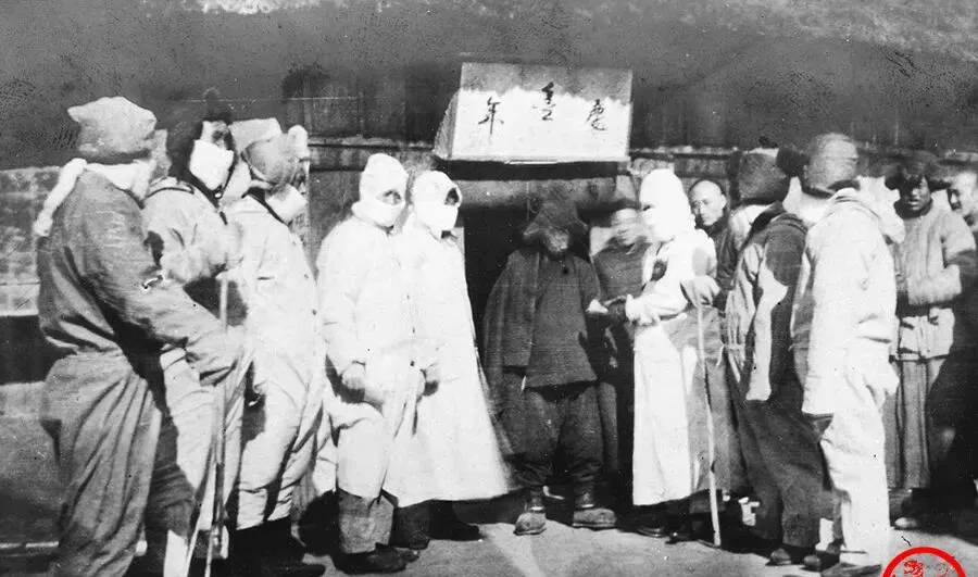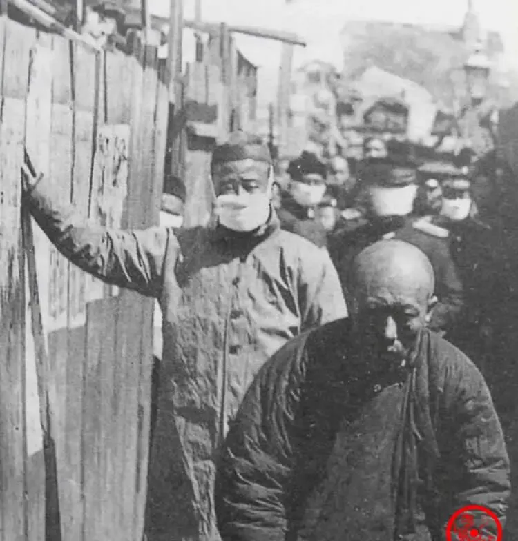 图里这一圈白布捂住口鼻的玩意儿就叫伍氏口罩,两层纱布夹药棉,中间吸湿,外层挡飞沫,绳子在耳后打结,贴合得紧,巡查的人一手扶着木栅,另一手示意后头别挤,前面老乡缩着脖子往前挪,那时候说话不多,动作快,先把会咳嗽的找出来再说。