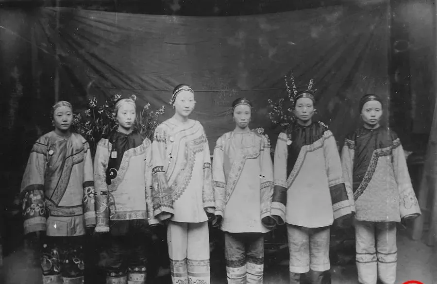 图中这几位女子叫大户人家的正妻与偏房合影,她们站成一排,绸缎袄子领口高高当当,滚边密密,袖口厚实,头上是旗头或小挽髻,发际线前额剃得光亮,眉眼并不妖娆,更多是清清冷冷的劲道,家里挑人先看门第与规矩,漂亮不漂亮反倒排在后头,奶奶以前讲过一句话,“娶妻求贤,纳妾求色”,照片里就能看出门道,穿戴齐整才是体面,笑不笑都要稳住分寸。