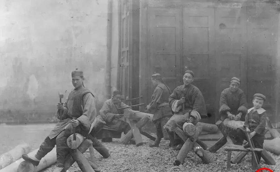 这个热闹场面叫木作场,木匠们骑在木马凳上,手里一把大快活锯,一把刨子铮亮,刨花像卷曲的面条扑簌簌落地,门口还蹲着个洋娃娃似的小男孩,好奇得很,师傅抬头冲他一笑说别伸手,木屑扎人,可那时候的门窗柜子全靠这班人,活口好坏一摸就知道。