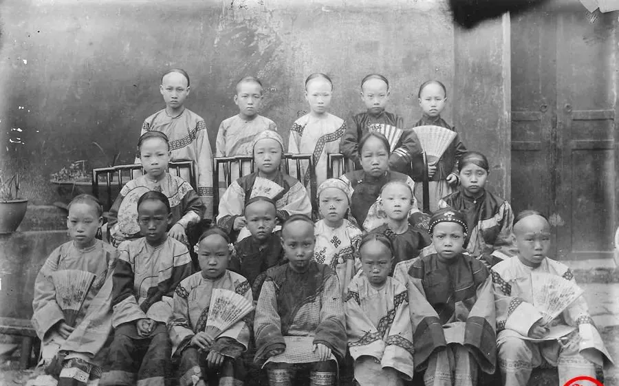 这一群梳着小辫的孩子叫女子学堂的学生,前额剃得光,脑后扎马尾,穿直身大襟,站得笔直,刚开始女娃进学堂,大人还嘀咕“读那书做啥”,可见识一开,针黹之外也能写字画图,现在的姑娘背着电脑走天下,那时候的启蒙就在这小小院子里悄悄生根。