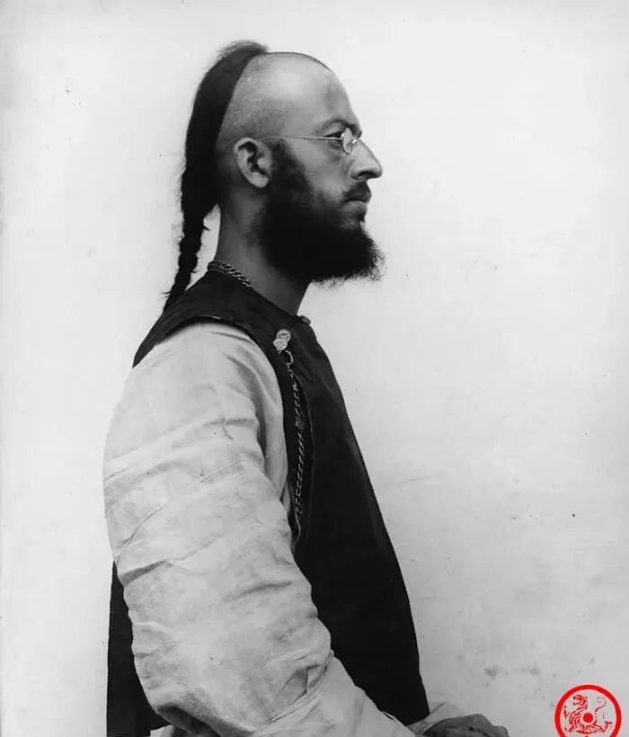 图中这个装扮叫剃发易服留辫,半个头剃净,后面留条长辫,身上罩着粗布长袍和坎肩,肩缝还别着一截小链子,镜片薄薄的圆眼镜卡在鼻梁上,侧影像刻刀刻出来的一样硬朗,这身打扮在当时是为了混同本地人的日常,走街串巷不惹眼,奶奶看了说,这样才好跟人拉家常,问路打听事也有人肯回,放在现在可稀奇了,理发店会愣住,不知道怎么下剪。