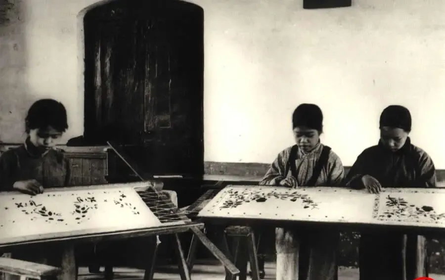 这个案子叫绣架,细木框拉着白绢,四角用绳子拽得绷直,丫头们身前一张一合地抬手落手,线团在指背上一绕,针尖一挑,叶片就落在布上了,细看边角还有石块压线,防止线头乱跑,小时候我在外婆屋里看过,她嘀咕说,绣花慢,慢才出**“秀巧的美”**,现在缝纫机嗡一响,图案刷刷就出来,快是快了,手味儿就淡了。