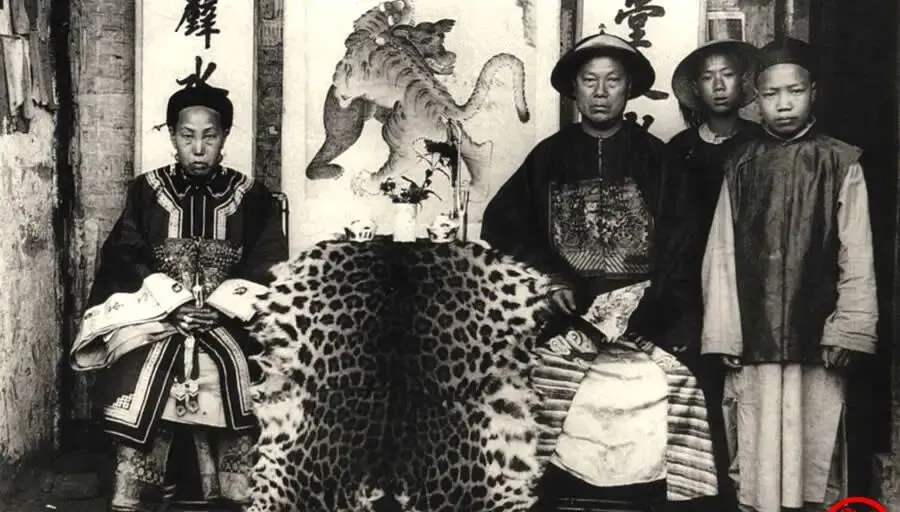 这个方块儿叫补子,绣着猛兽纹贴在胸前,屋里墙上还挂着一幅兽图,桌上铺的也是豹皮,纹理对称地铺开,气势照人,妇人的衣襟是宽边滚绫,袖口翻着绣线的亮光,旁边的少年束着带子站得直,家里有头脸的人拍照总这么摆,讲的是门第与品级,现在照相更随意了,笑一笑举手比心就完事。