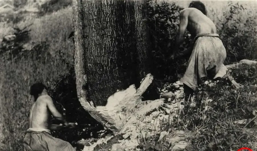 这两位手里的是大斧,柄长过臂,刃口斜着劈进树身,先在一面开个喇叭口,再从另一面补刀,砍到树心松动,咔嚓一声才肯倒,地点像在山腰,脚下是碎石和根须,搬运没有车,靠肩挑连拖带拽,爸爸说,以前干活讲“多出苦力”,现在讲“多出机械”,一句话的差别,背后是整整一代人的腰。