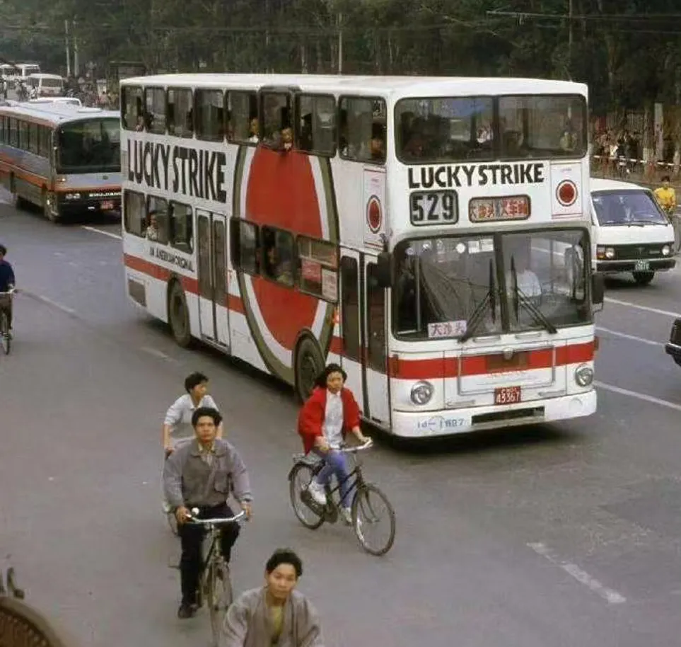 画面里,一辆印着“LUCKY STRIKE”广告的双层巴士,正沿着宽阔的马路缓缓行驶,车身的红白配色在灰调街景中格外醒目,车身上“529”的线路编号和“大沙头”的目的地标识,瞬间将人拉回那个充满烟火气的年代。