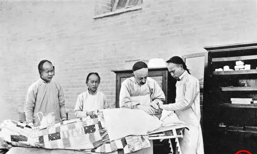 这张摆在砖墙下的就叫简陋手术室,木柜里摞着纱布和罐子,床上盖拼布被,几个助手把袖子挽到胳膊肘,主刀低头找血管,壶嘴还冒着白气,像刚刚用开水煮过器械,听老人说那位洋医生会说几句土话,剃了前额留了辫子,走街串巷给人看病,条件差得很,一年也能做下好些台手术,这在当时算是响当当的医馆了。