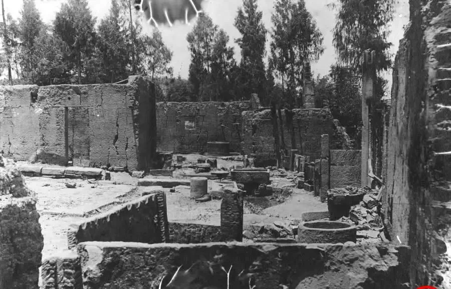 这个被火洗过的院落叫空场,地上圆圆的是石臼和井圈,墙根残着门枕和门洞印,抬眼四周尽是焦黑缺口,风吹过会响,像壶里嘶嘶的气,细看泥缝里还嵌着碎瓦齿,说明当年是**“石木混盖”**的土屋,事情过后,人先回地里抢种,房子就这么晾着,能住的角落先支一张草席,对付几宿再说。