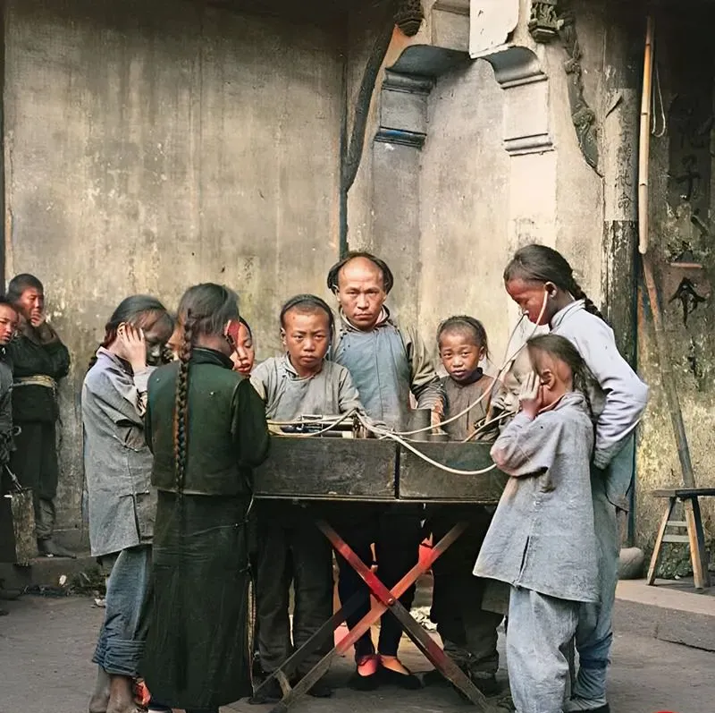 这个桌上的家伙叫留声机摊,木箱子摆在巷口,几根线像面条一样分出去,孩子们一人攥一个听头,面无表情地站着,其实耳朵里热闹得很,咿咿呀呀的戏曲、吱吱啦啦的杂音糅在一块儿,老板把转柄一摇,唱片走起来,旁边的大人装正经,其实眼神也飘过去了,以前弄这么一个摊,靠一台机子就能赚学费,现在手机外放一开,谁还稀罕往耳朵里塞这么粗的听筒。