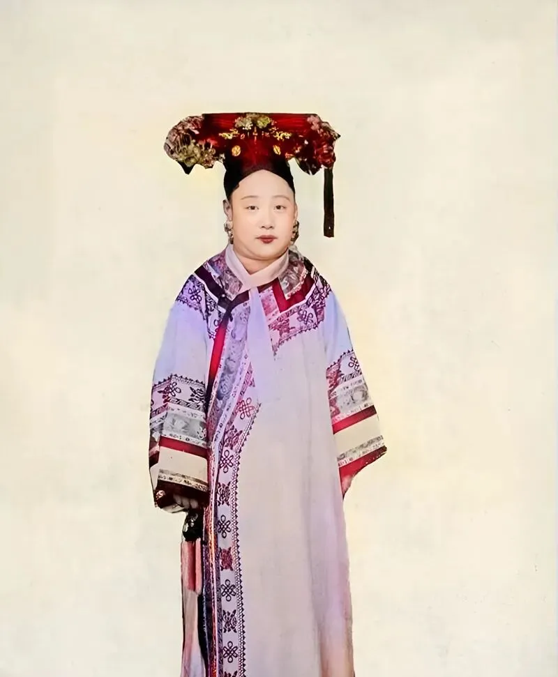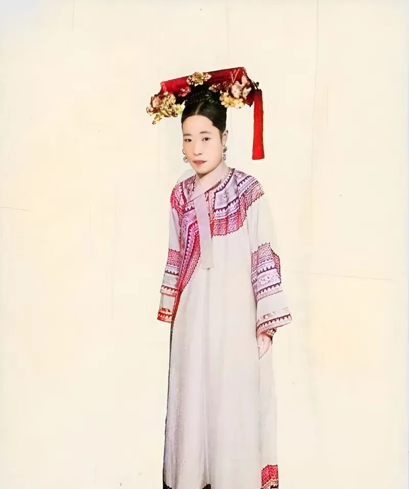 这个红缨压顶的是后宫的妃子站像,宽袖长襟一路垂到脚面,袖口里衬着细碎的几何纹,耳垂吊着素圈,脸圆,脖颈被衣领勒得紧紧的,整个人像被规矩端着站直了,妈妈看照片只说了一句,衣裳值钱,身子不见得舒坦。