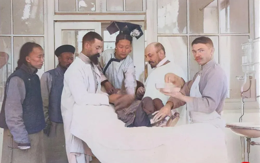 这个场景叫西医院的治疗室,白袍的医生把纱布在掌心摊开,旁边的同伴按着孩子的腿,墙上玻璃窗把光压得冷冷的,角落里悬着玻璃滴瓶,像一只大水泡,右二那位谢顶的在处理伤口,围观的旗人家属攥着帽子不敢喘粗气,那时候看西医是稀奇,爷爷说去一趟得反复打听,生怕给孩子伤了元气,现在小诊所扎针换药,谁还纠结这道理。