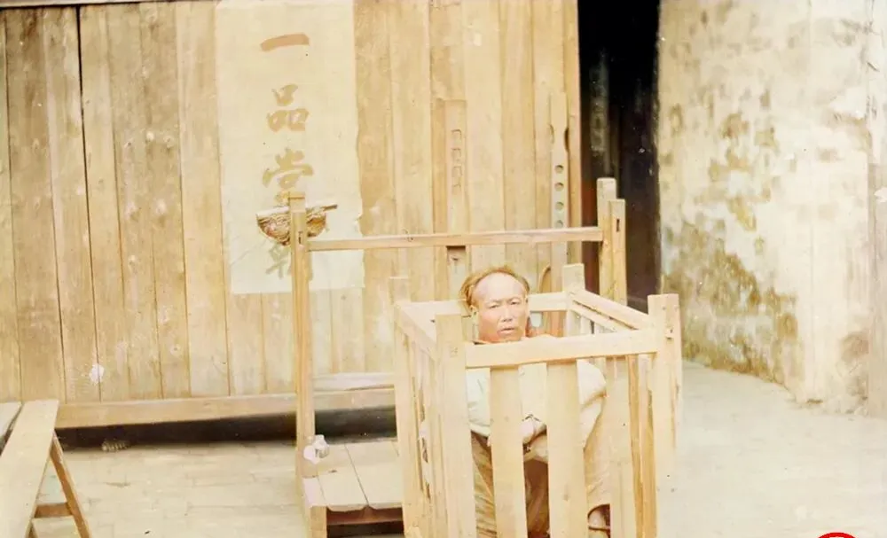 这个木栏叫囚笼,四面立柱用榫卯咬合,腰部一道横档卡住,犯人蹲在里头动弹不得,地上留了一盏油灯的小碟,墙上贴着“一品赏”的褪色字,刺眼得很,案犯的眼神发直,又像在和谁对峙,叔叔小时候在县衙旧屋里见过类似的木框,说搬不动,沉得很,现在说起刑具,大家多半只在影视里见,真东西只剩冷木头味。
