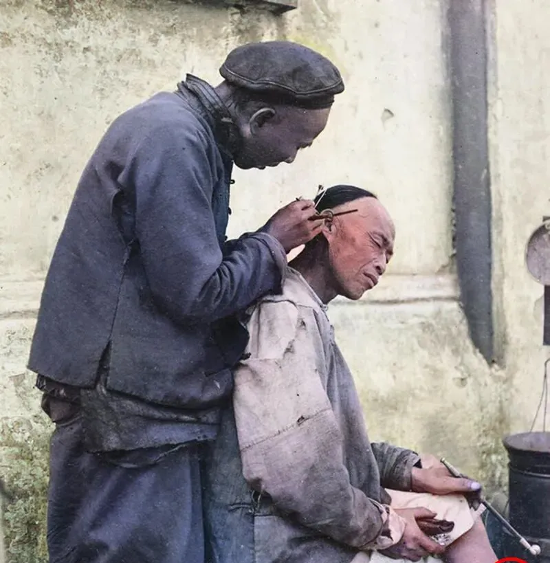 这个活儿叫采耳,师傅一只手按着客人的发辫根,另一只手捏着细细的钢丝勾子,在耳道里轻轻挑,末梢吊着毛绒球,扫过去痒酥酥的,赶集那天我也坐过一回小马扎,师傅在我耳边轻声说别动,稍一抖就跑偏,镜头定住的这一瞬,恰好能看出享受的表情,放在现在,理发店里也能做,可那份街角的松弛味儿,早散了。
