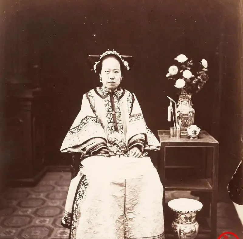 这个端坐的女子叫照相馆摆拍,绸缎团花的坎肩亮得扎眼,袖口镶边翻得宽,耳坠沉甸甸的,旁边一只细口花瓶插菊,案上茶盏和旱烟管一摆,身份就不言自明了,妈妈看着说这坐姿学过的,背杆直,手指并拢,照片看着冷冷的,其实是那会儿曝光慢,谁都不敢眨眼。