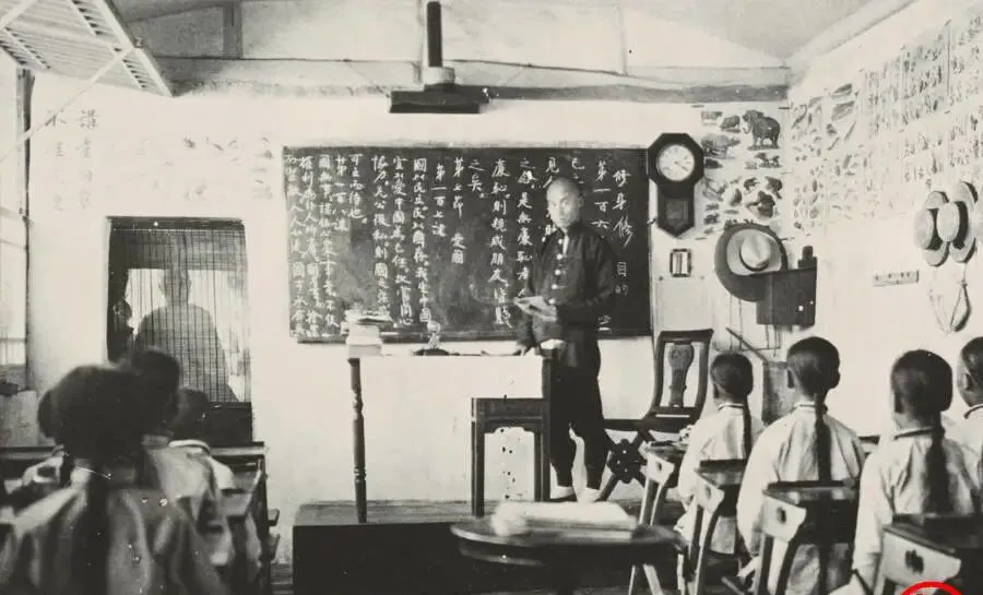 这个黑板上的粉笔字叫修身课,老师面朝学童,板书一列写着“我生中国,宜以爱中国为己任”,墙上还贴着识物图,椅背靠得直直的,钟摆嘀嗒,窗外有人影探看,小时候我在县里老校也见过这种长条课桌,铁框木板一体,写字抖手就“吱呀”一声,现在电子屏亮一下就切图,那时候一根粉笔能撑一学期。