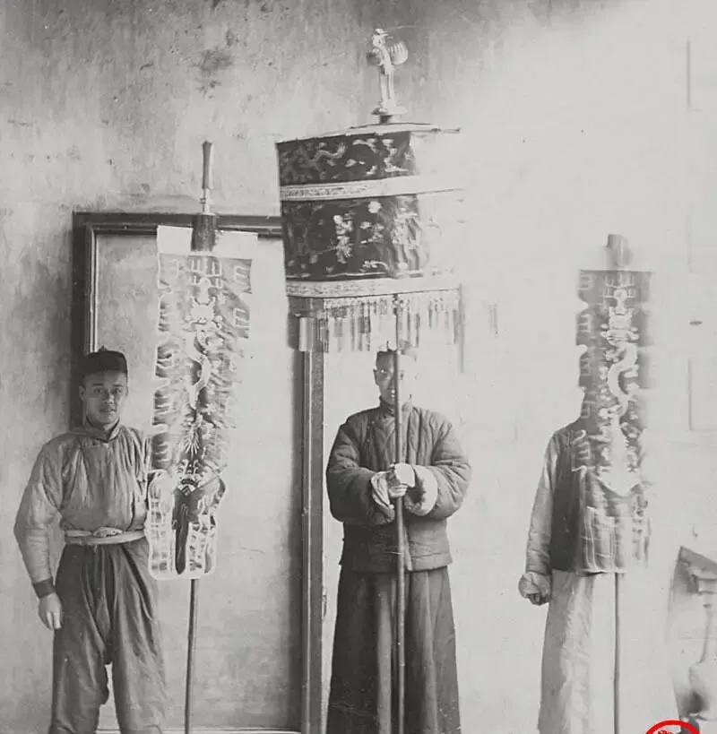 这个高高举着的叫华盖,那两面垂穗的叫绣龙幡,粗杆立地,伞面缎料厚,边沿坠流苏,龙纹一抹银光,抬的人把肩往上一顶,生怕晃到,奶奶说遇见这种器物,得让路,都是体面场合用的,现在的礼仪旗子一插就完事,那会儿一根杆子就是一份人情分量。