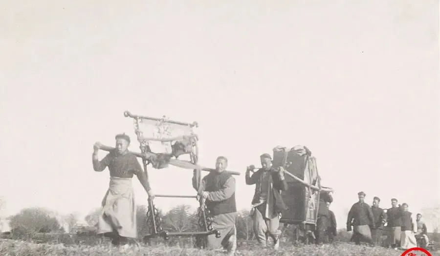 晚清老照片:大婚之际新娘嫁妆抬到夫家,少年儿童穿破衣打赤脚.