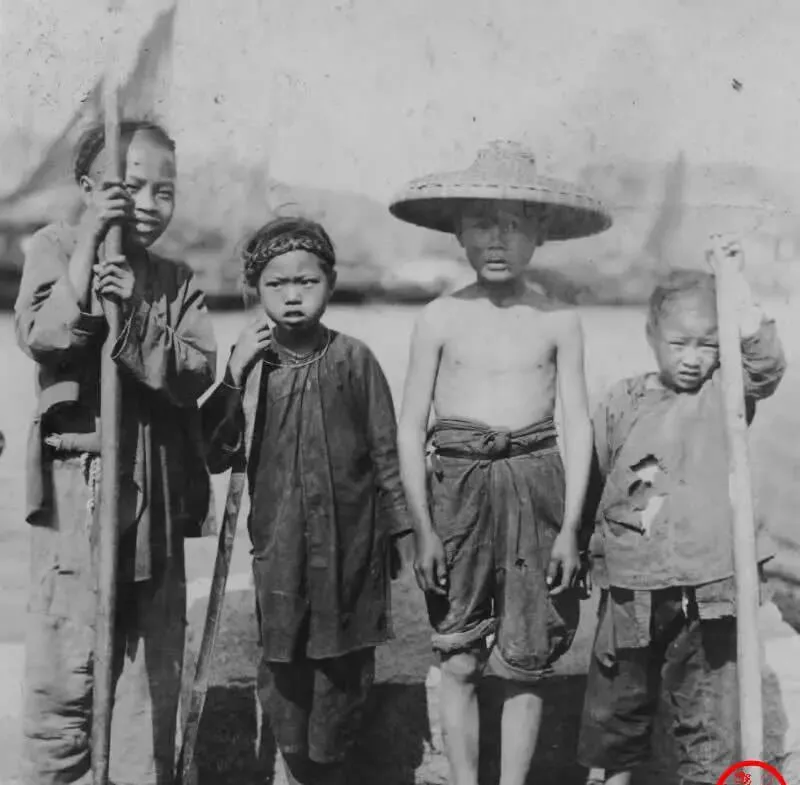 图中这群小孩叫苦日子照,衣襟磨光,袖口露线头,最小的那位衣服上窟窿一圈一圈的,脚底下全是土,只有一个戴了草编宽檐帽,手里都攥着竹竿或木棍,像是要去河边看船,外婆说那会儿穷得买不起鞋,一年四季打赤脚,冬天就把脚怼在灶膛边烤一下,现在小孩挑鞋得挑到第几代泡棉才舒服,唉,一想就有点酸。
