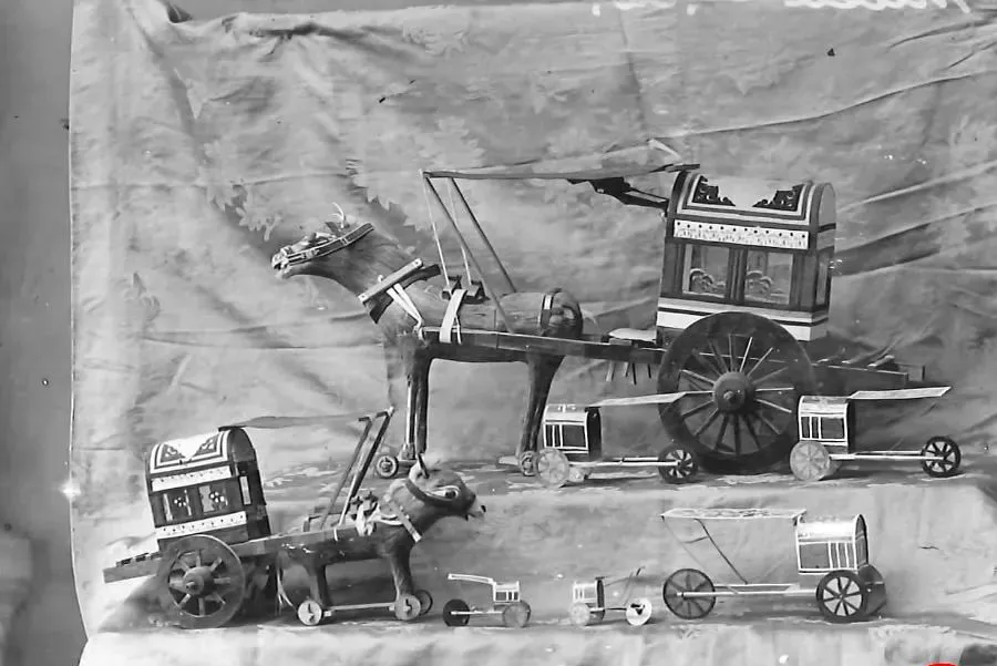 图里这些小车小马是纸木玩具,木轮子扎铁钉,车厢用纸糊着彩边,马脖子还挂着细细的缰绳,爷爷说庙会一到,摊子上摆一片,孩子攒半个多月的小钱,挑一个最响的回家,推在地上咕噜噜转,院里的鸡都被吓得扑棱着翅膀跑开。