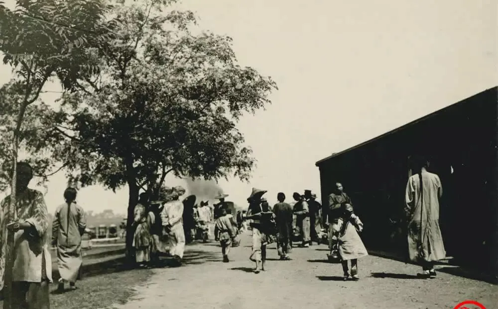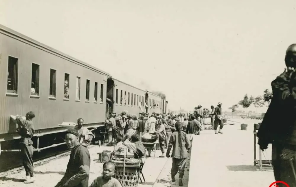 图中这一溜木质车厢边围着的就是清末车站的小商贩,篮子里多是馄饨干粮茶水,还有现切的糖糕和瓜子,车一靠站就冲上来,抓着窗框递东西,银元铜板当场找钱,列车再一动,他们就提篮子小跑跟着,嘴里还不忘吆喝两句,那个热闹劲儿,比现在的零食车可实在多了。
