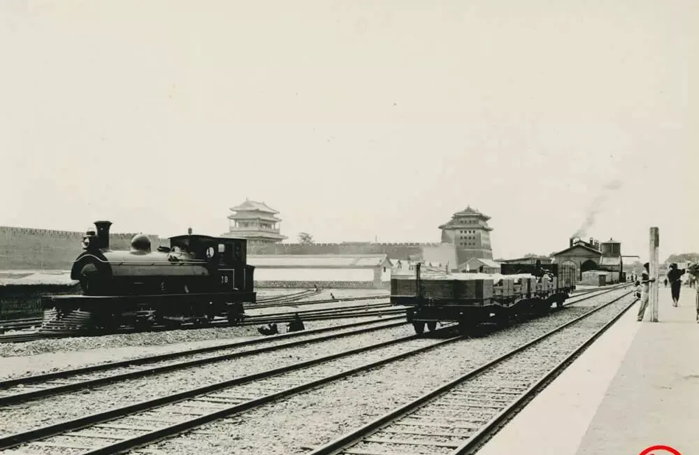 这个黑乎乎的小家伙叫蒸汽机车,肚皮圆鼓鼓的,烟囱像茶壶嘴,后面牵着平板车运木料,远处能看见城楼和箭楼,站台直愣愣铺到城根下,妈妈第一次带我去北京,路过西直门还指着说,以前就是从这儿出京上张家口的路,现在地铁口一出来就是商场了,老城墙只剩一段影子。
