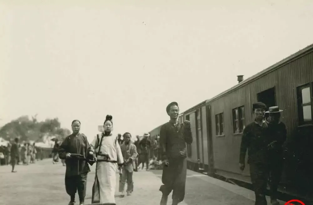图中这位提着包袱的叫长衫旅人,脚上布鞋,脑后留着辫子,旁边两个挑行李的脚步飞快,车门口还有人探头张望,清末到民初这一身行头最常见,坐火车可不是日常事,得攒够路费,亲戚们还会送到站口,嘱咐到哪儿给谁捎封信,话没说完车就开了。