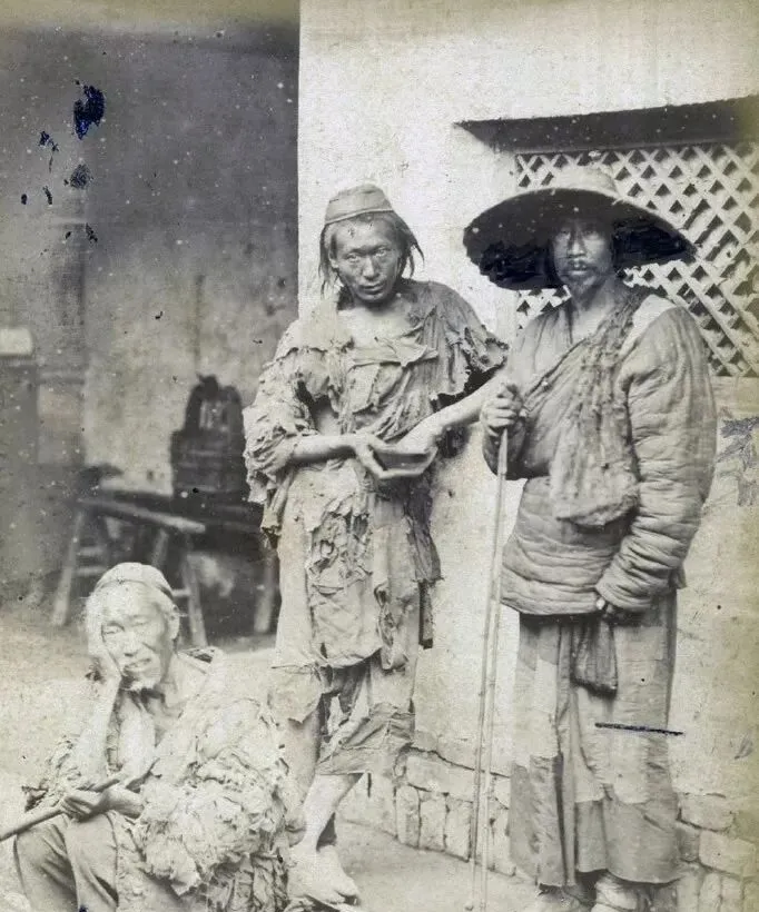 图中这三位是当时城里常见的讨米人,破布一层叠一层,肩头袖口全是毛边,手里端着个小木钵,站的那位还拄着根细长的竹杖,墙根阴凉处坐着的老者叼着烟杆不吭声,风一吹,衣襟上的灰渣簌簌往下掉,奶奶看了说,那会儿灾年一来,巷口总能碰到这样的身影,现在我们随手一单外卖就吃饱了,那时候能混到一碗稀粥已算走运。