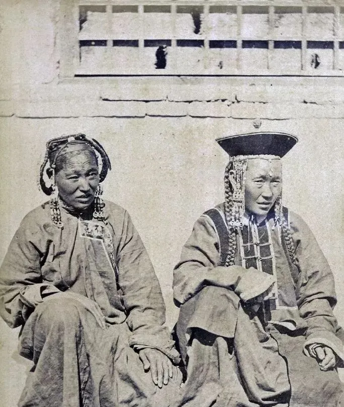 图中这对妇女戴的是节日头面,串珠沿鬓垂下,帽檐平阔,外袍直身,袖口翻得宽宽的,坐在晒得发白的墙下,太阳光把褶皱照得清清楚楚,奶奶说,远路一看就知道是喜庆日子,头上的银饰一摇就叮当,走起路来跟风赛跑,现在节日服多进了展柜里,穿一次得挑好场合才舍得。