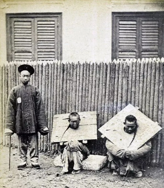 这个方框框叫木枷,厚板挖孔,锁在颈上,人坐也不得劲站也不得劲,旁边的差役穿着号衣,手里拿着短棍站着,路边竖木桩排成篱笆,阳光打在板面上泛着白,母亲叹气说,老法子讲究示众,苦头是给人看的,现在讲人权讲程序,错了对了有章可循,不用把羞辱挂在脖子上走街串巷。