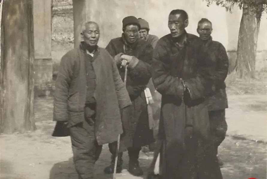 图中这几位是被裁撤后流落到庙里的老太监,棉袍褪色发亮,袖口磨出毛边,走路都靠着彼此的步子往前挪,最前头那位手里拄着一根细瘦的木杖,杖头被磨得圆润发黑,说明不止走了一天半宿,更多是把它当命根子抓着,庙门外的土路坑洼不平,鞋底粘了土,走一步带一片影子,旁人看着觉得慢,他自己知道每一步都在跟身体打商量。